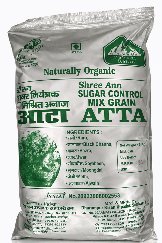Farm-fresh Pahadi Rattan Sugar Control Mix Grain Aata 5KG, naturally grown without chemical pesticides. Stone-ground/hand-sorted by farmer families. Sourced directly from Himalayan farmer cooperatives (FPOs) under the Harvesting Farmer Network. Wholesome nutrition from Himalayan soil.