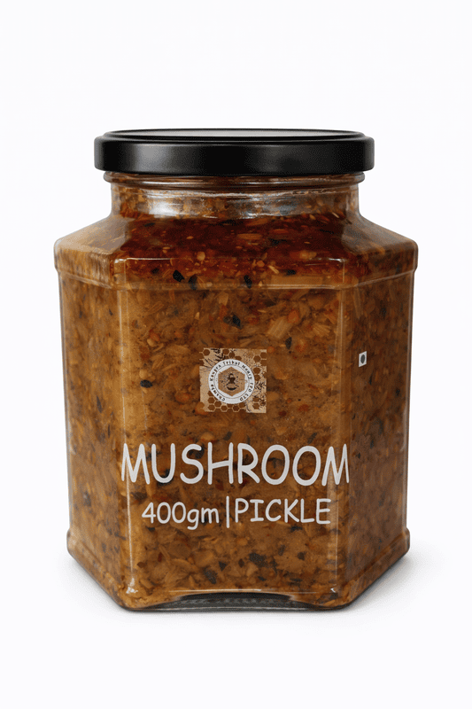 Authentic Himachali Mashroom Pickle 400g, handmade using traditional recipes. No artificial preservatives or colors. Sourced directly from Himalayan farmer cooperatives (FPOs) under the Harvesting Farmer Network. Perfect with parathas, rice, or as a side.