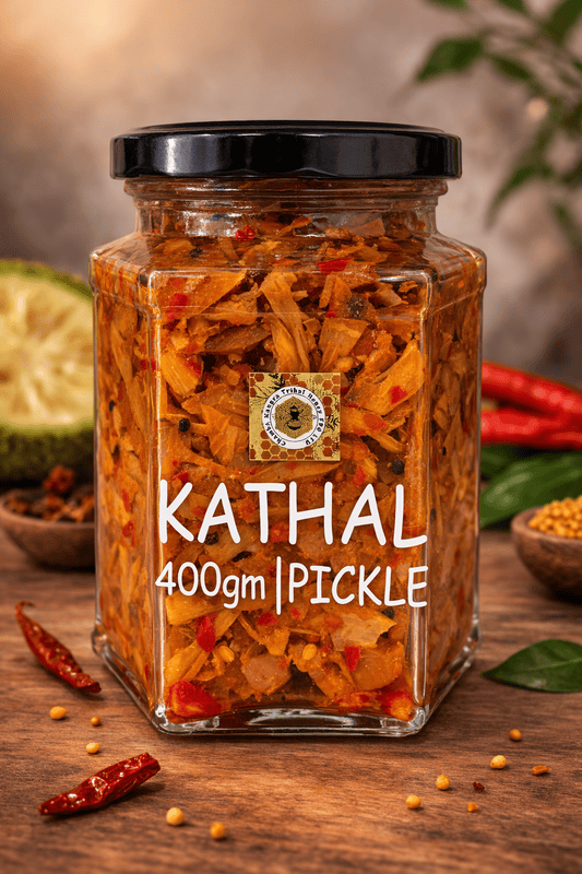 Authentic Himachali Kathal Pickle 400g, handmade using traditional recipes. No artificial preservatives or colors. Sourced directly from Himalayan farmer cooperatives (FPOs) under the Harvesting Farmer Network. Perfect with parathas, rice, or as a side.
