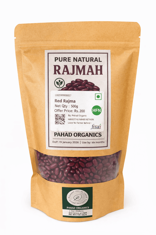 Farm-fresh Red Rajma, naturally grown without chemical pesticides. Stone-ground/hand-sorted by farmer families. Sourced directly from Himalayan farmer cooperatives (FPOs) under the Harvesting Farmer Network. Wholesome nutrition from Himalayan soil.