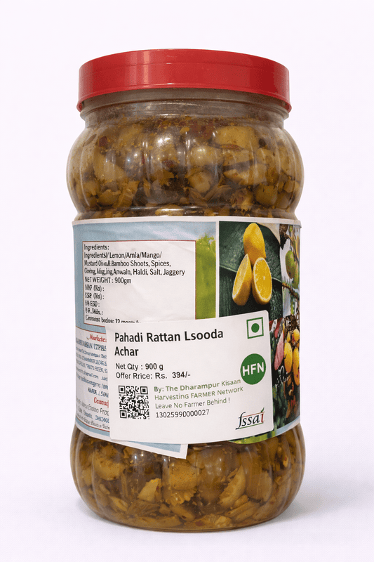 Authentic Himachali Pahadi Rattan Lsooda Achar, handmade using traditional recipes. No artificial preservatives or colors. Sourced directly from Himalayan farmer cooperatives (FPOs) under the Harvesting Farmer Network. Perfect with parathas, rice, or as a side.