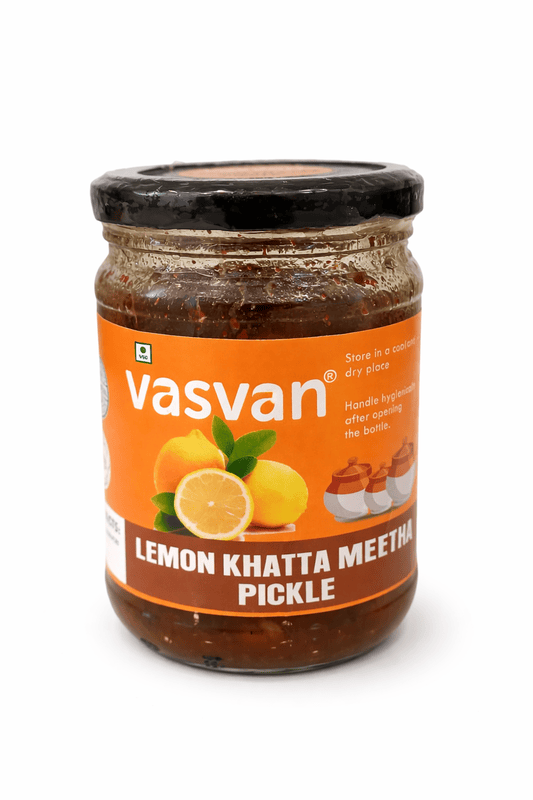 "About Product: Enjoy the delicious taste of Vasvan Lemon Khatta Meetha Pickle, made using carefully selected lemons and traditional Indian spices. This pickle offers a perfect balance of sweet and tangy flavors that enhance every meal. Prepared in a hygienic environment, this achar delivers a homemade taste with rich aroma and authentic texture. Whether paired with everyday meals or special dishes, it adds a burst of flavor to your plate. Source: Vasvan Farmer Producer Company Limited Product Type: Lemon Pickle (Khatta Meetha) Net Weight: 500g Storage: Store in a cool & dry place Packaging Type: Glass Jar Product Benefits Traditional Indian recipe Balanced sweet & sour taste No artificial preservatives Premium quality ingredients"