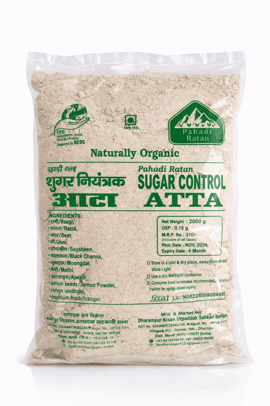 Farm-fresh Pahadi Rattan Sugar Control Mix Grain Aata 2KG, naturally grown without chemical pesticides. Stone-ground/hand-sorted by farmer families. Sourced directly from Himalayan farmer cooperatives (FPOs) under the Harvesting Farmer Network. Wholesome nutrition from Himalayan soil.